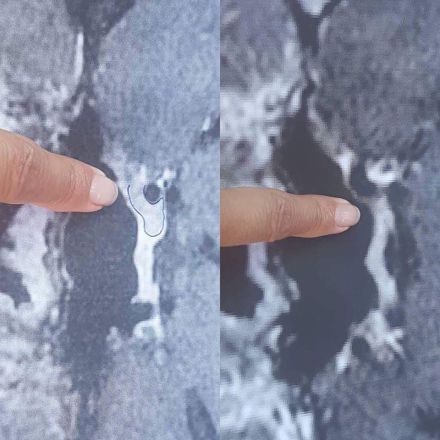 Ainsi, Kimmy montre deux IRMs. Le premier montre une tumeur que l’on peut voir circonscrite par un périmètre bleu. Le second IRM montre que la tumeur a disparu. Elle montre également le scanner (fait en 2017 quelque temps avant son post) qui est comparé par son médecin à celui fait en mars 2014. Son cancérologue résume ce qu’il voit sur le scanner :