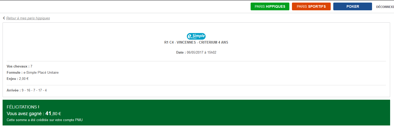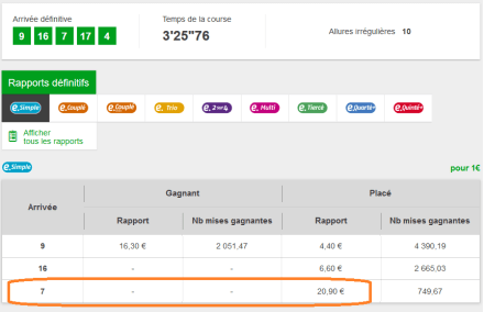 Note du traducteur : « Placé » signifie arrivé dans les trois premiers. Si vous avez joué placé, et votre cheval l’est effectivement, vous gagnez.